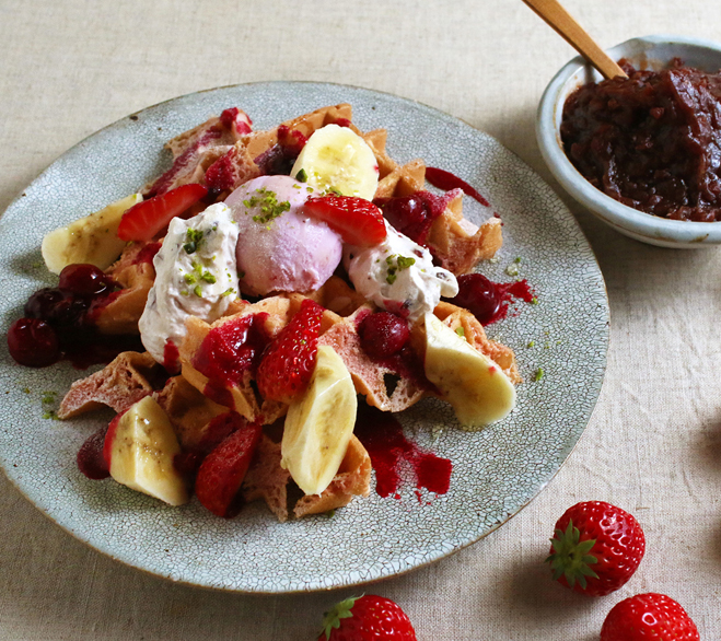 苺ピューレを生地に混ぜ込んで苺が香るピンク色のワッフルに。