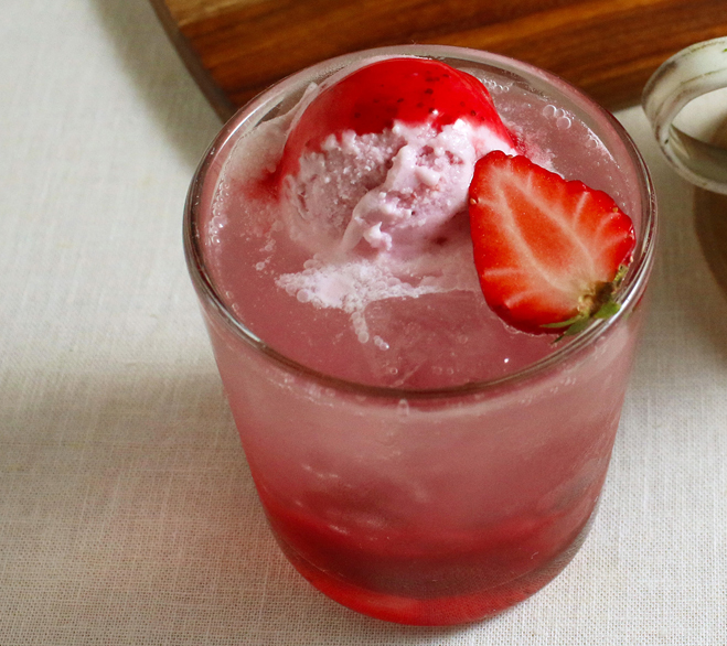 赤のグラデーションがきれいなスカッシュに苺アイスをのせた、甘酸っぱいフロートです。