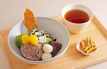 紅あずまとかぼちゃ生麩のみたらし和パフェ